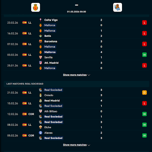 Cuộc chạm trán giữa RCD Mallorca và Real Sociedad được đánh giá là màn so tài cân bằng nhưng đội khách phần nào nhỉnh hơn về chất lượng đội hình. Mallorca khi chơi trên sân nhà luôn thể hiện tinh thần thi đấu quyết liệt, ưu tiên sự chắc chắn và sẵn sàng va chạm. Tuy nhiên, hàng công của họ thiếu sự bùng nổ và thường gặp khó trước các đội có tổ chức tốt. Việc phụ thuộc vào những tình huống cố định khiến lối chơi của Mallorca trở nên dễ bắt bài. Nếu không cải thiện khả năng dứt điểm, họ khó tạo ra khác biệt.